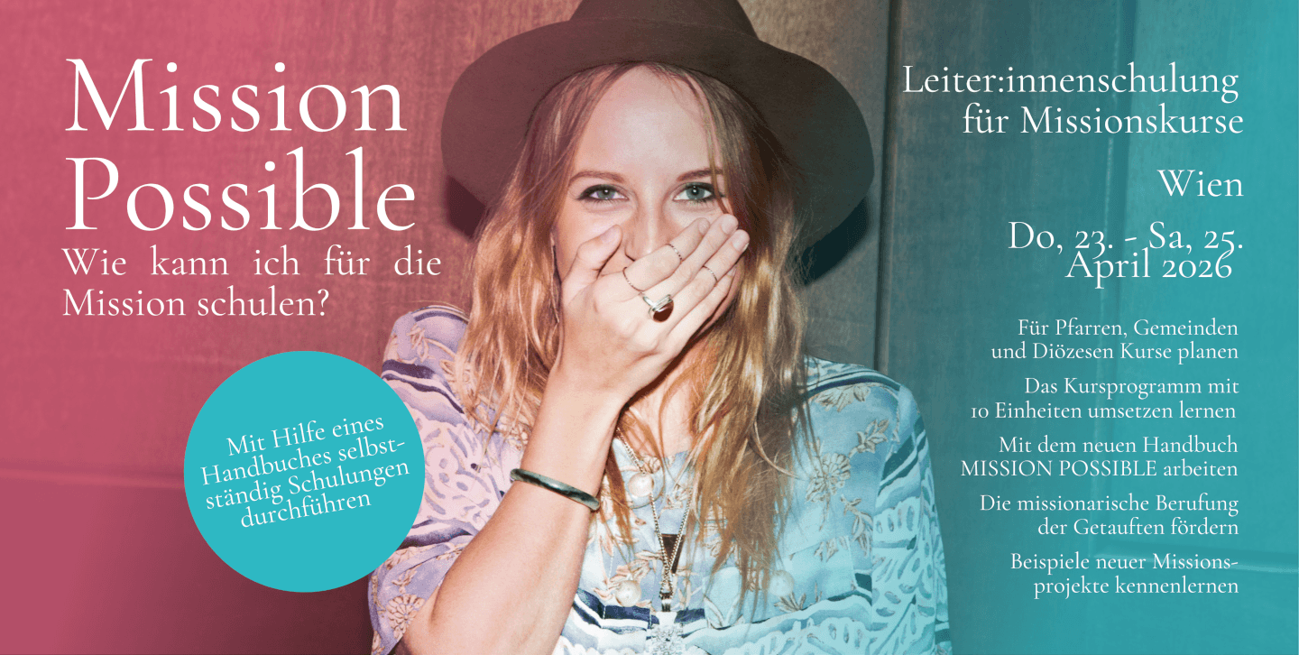 In diesem Seminar erarbeiten die Teilnehmer gemeinsam mit der Kursleitung, wie man den Kurs MISSION POSSIBLE in seiner eigenen Gemeinde oder Gemeinschaft umsetzen und leiten kann. Es werden die Inhalte des Kurses besprochen und der Frage von Organisation und Leitungskompetenzen nachgegangen. Die Schulung richtet sich an hauptamtliche kirchliche Mitarbeiter genauso wie an Personen, die sich ehrenamtlich in Gemeinden, Bewegungen und Gemeinschaften engagieren. Kurseinheiten: Donnerstag: 16.00-21.30 Freitag: 9.00-21.00 Samstag: 9.00-18.00 Nähere Information bei Maja Schanovsky unter +43 664 8187707 Noch mehr Infos zum MISSION POSSIBLE…