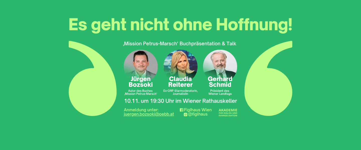 10.11.2025, 19:30 Uhr im Wiener Rathauskeller mit: Jürgen Bozsoki - Autor des Buches ‚Mission Petrus-Marsch‘ Gerhard Schmid - Präsident des Wiener Landtags Claudia Reiterer - Ex-ORF-Starmoderatorin, Journalistin Moderation: Otto Neubauer Anmeldung unter: juergen.bozsoki@oebb.at